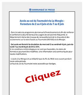 Communiqué de presse relatif à la fermeture de l’accès au Col du Tourmalet via La Mongie du 2 au 4 juin et du 7 au 8 juin