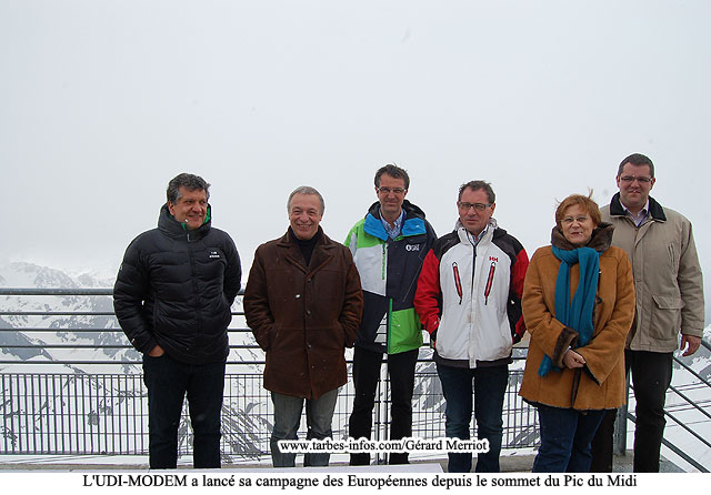 Hier, la liste UDI-MODEM-Les Européennes conduite dans le Sud-Ouest par le député sortant Robert Rochefort, a lancé sa campagne dans notre département depuis le sommet du Pic du Midi. Il était accompagné des numéros 2 et 3 : Muriel Boulmier, adjointe au maire d’Agen (Nouveau Centre) et Jean Iglésis, président UDI Haute-Garonne. Ils ont été accueillis par Jean-Bernard Sempastous, maire UDI de Bagnères-de-Bigorre, Gilles Craspay, président départemental et délégué de l’UDI 65, candidat lui aussi mais en position non éligible. Étaient également présents : Laurence Ancien conseillère municipale de Tarbes (liste Tarbes pour Tous), Franck Aubard (UDI) et Ludovic Gaté (Modem).