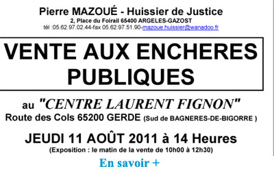 • Le jeudi 11 août 2011, à 14h : Vente aux enchères publiques au "centre Laurent Fignon" par Me Pierre Mazoué, huissier de justice
